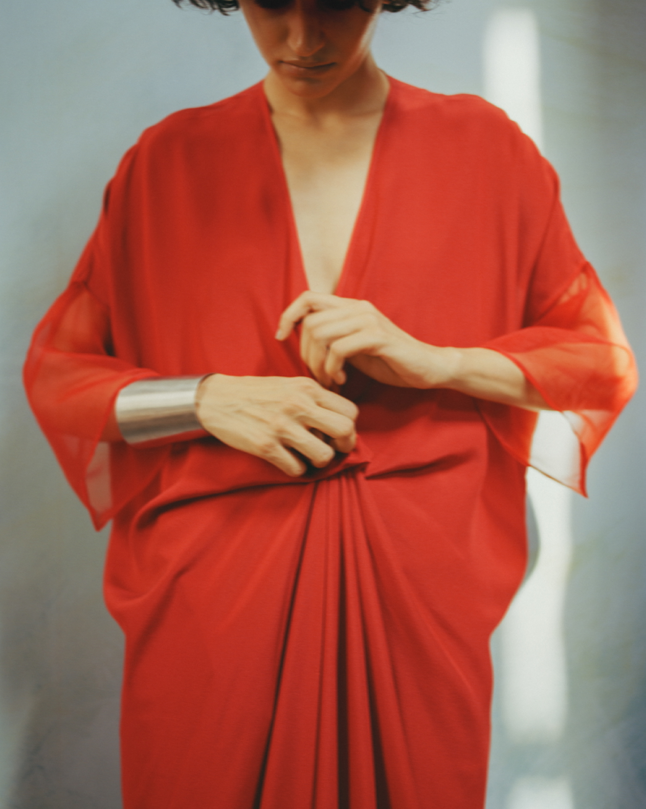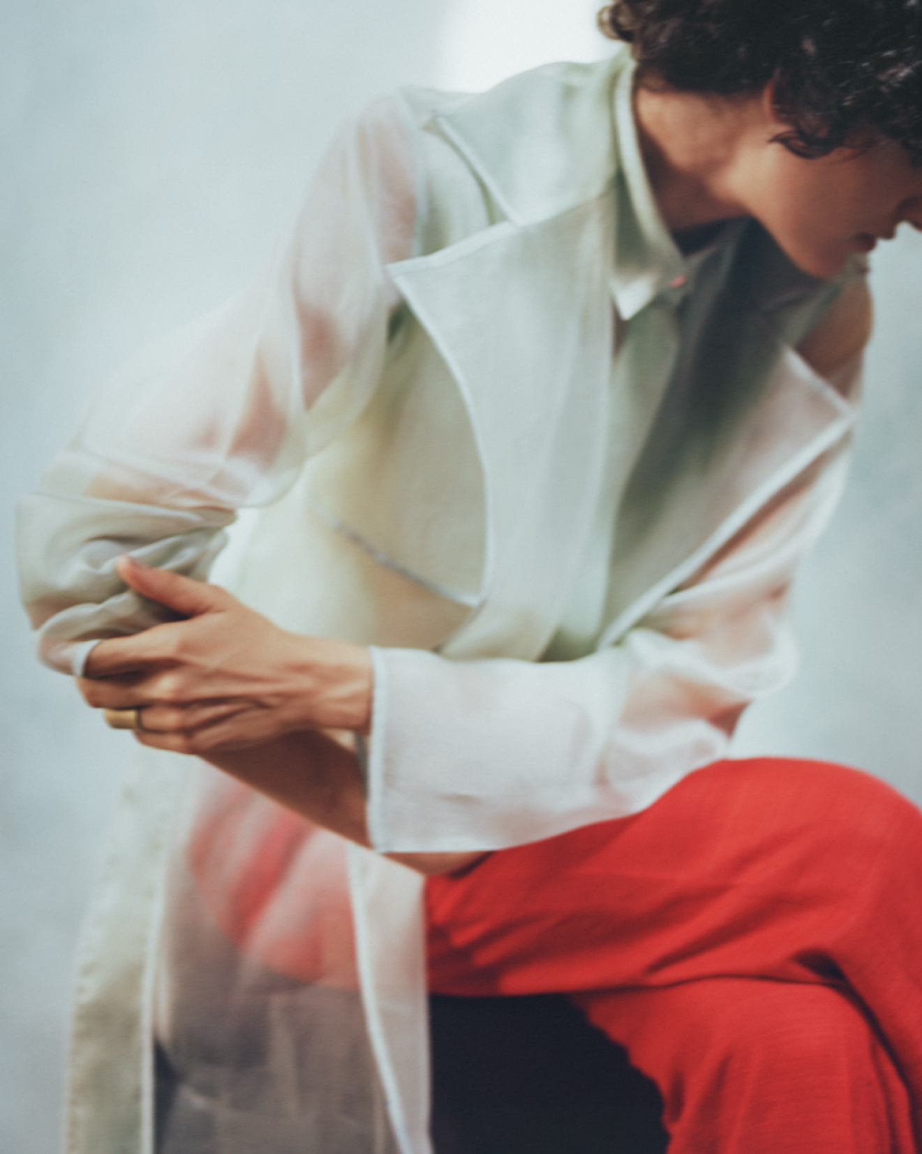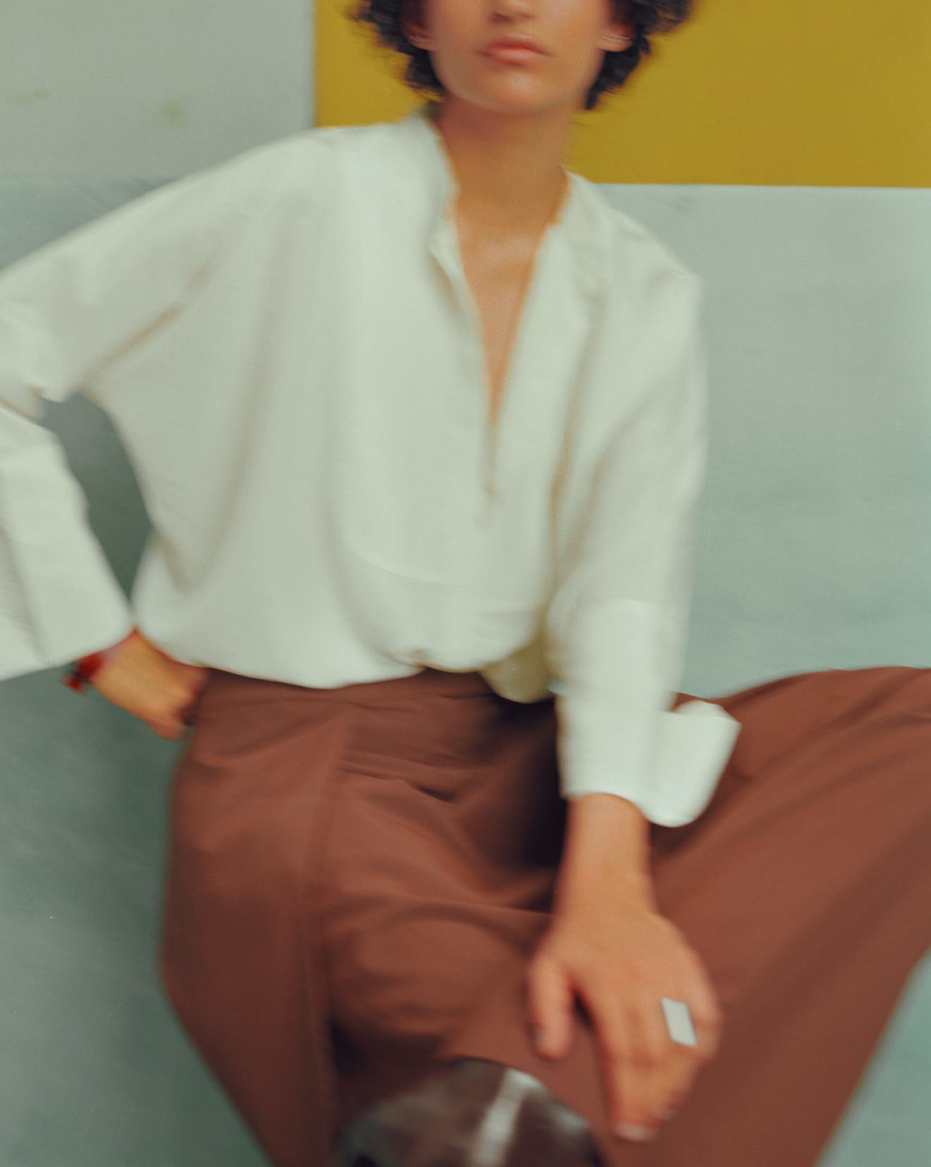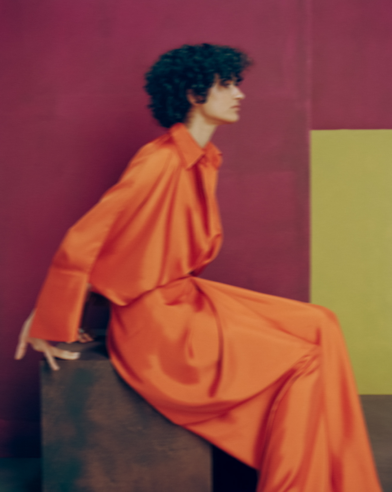 Fabric dictates the form. The material’s inherent rhythm guides the silhouette. Textiles sourced from Japan allow for play with drape, while soft, fine grain poplins bring crisp folds and structure. The colours move between soft pastels and grounded neutrals with vivid accents bringing quiet drama to a fresh but controlled palette.