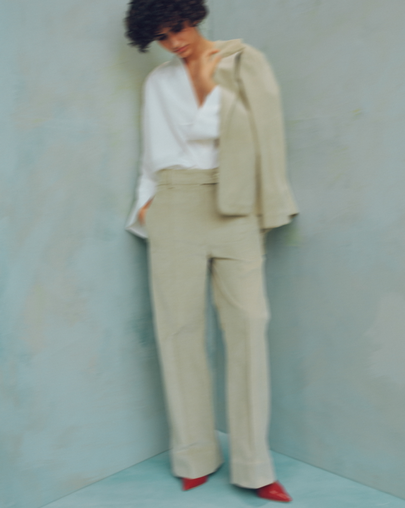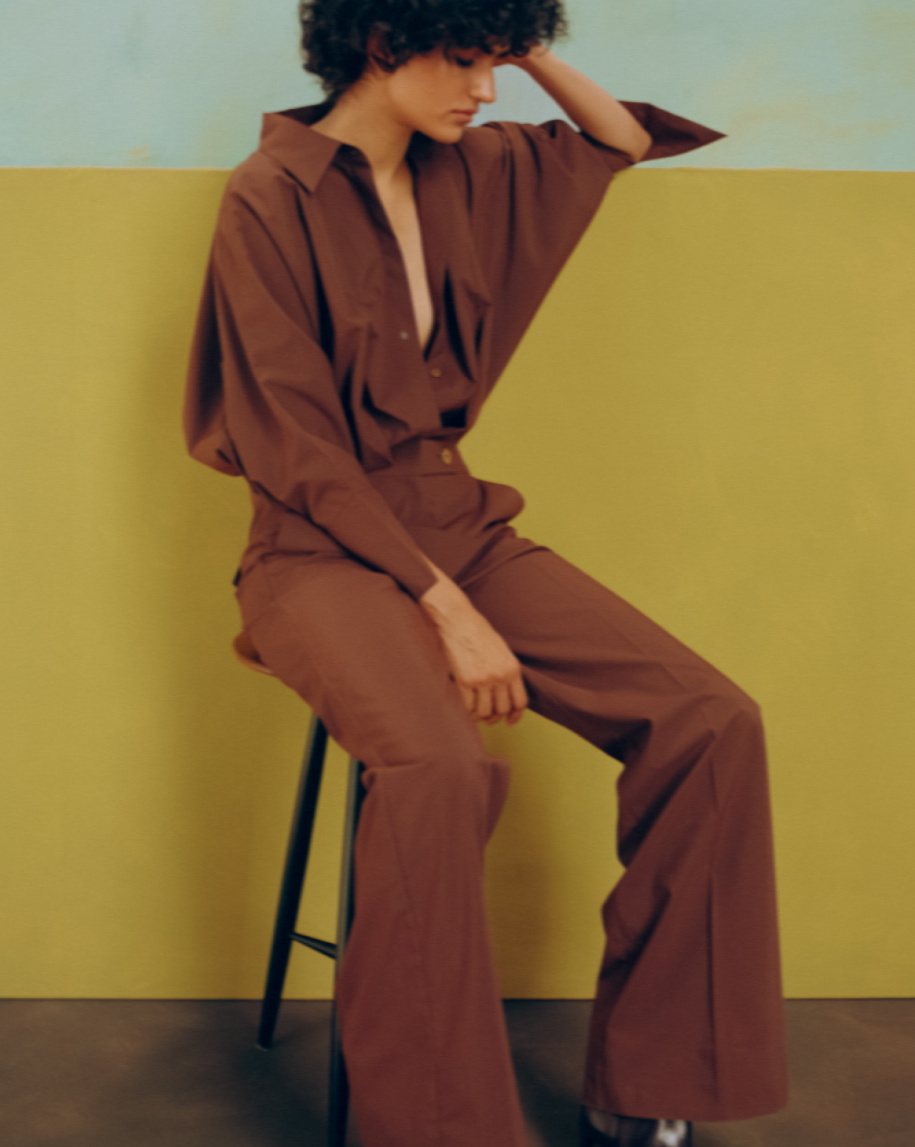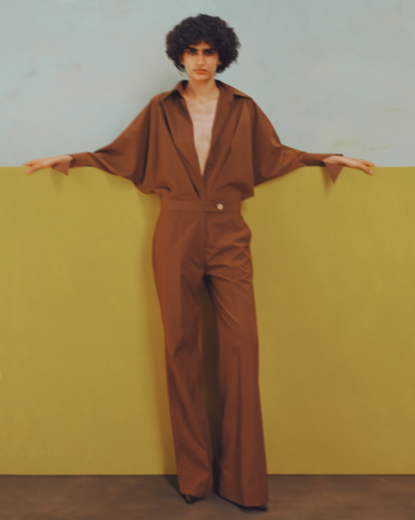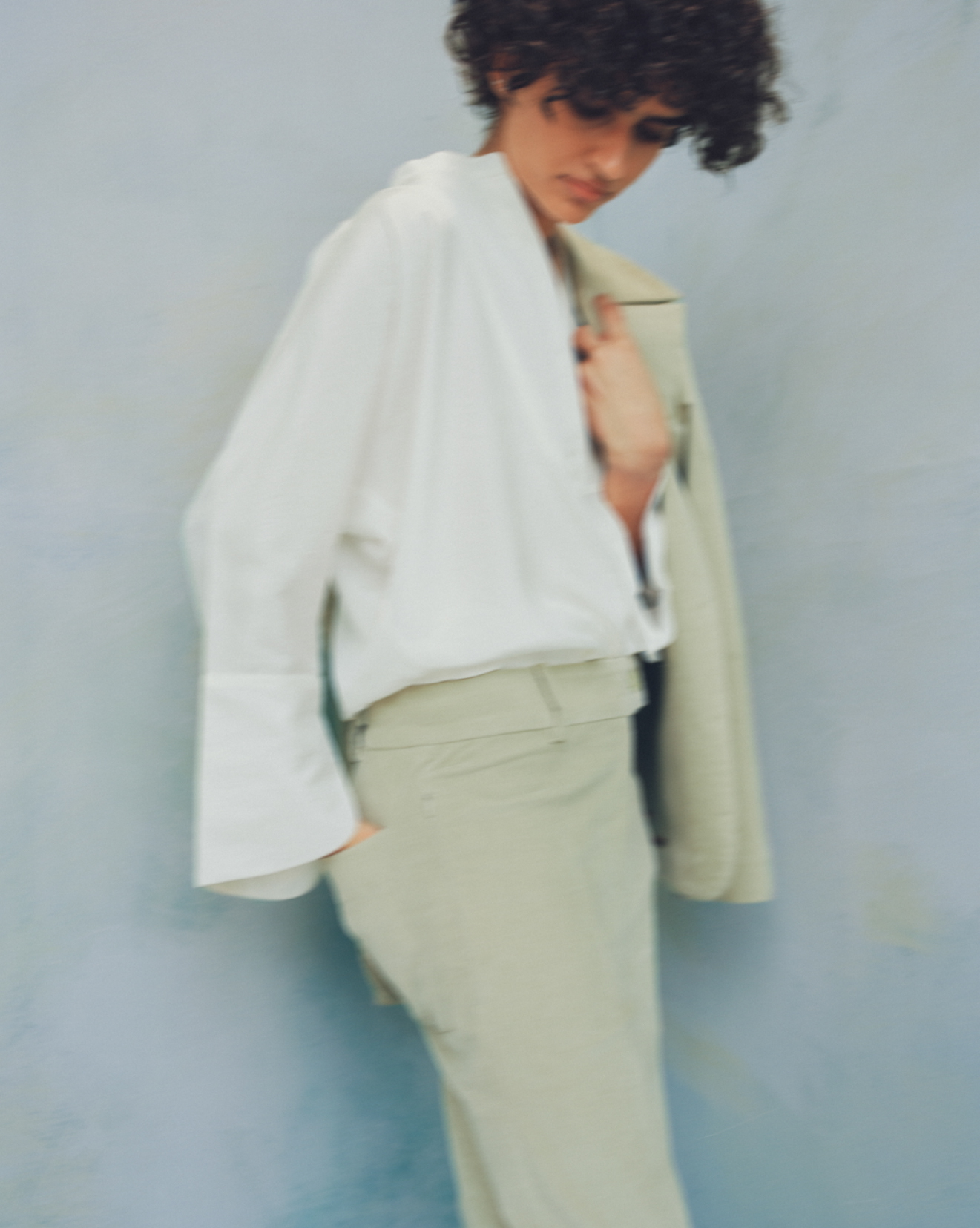 Fabric dictates the form. The material’s inherent rhythm guides the silhouette. Textiles sourced from Japan allow for play with drape, while soft, fine grain poplins bring crisp folds and structure. The colours move between soft pastels and grounded neutrals with vivid accents bringing quiet drama to a fresh but controlled palette.